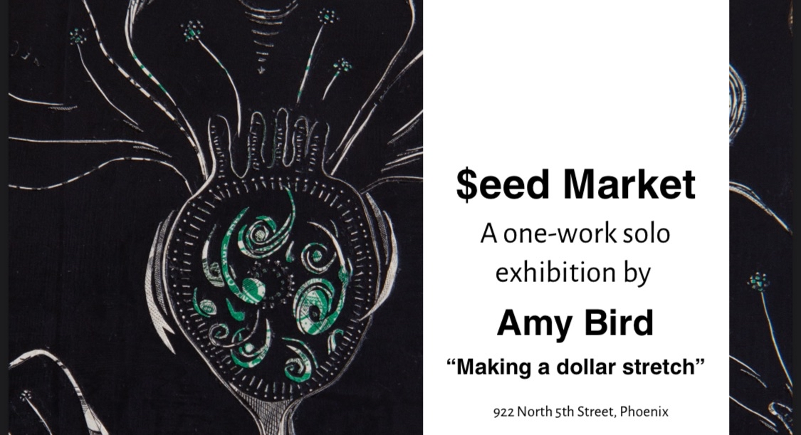 $eed Market* is a 12-panel collage constructed from a single U.S. dollar bill. This exhibition is an example of “making a dollar stretch” by valuing every part of the whole. Where do we look for stories of abundance rather than scarcity; generosity rather than greed; humility rather arrogance? What if a story like that can be found inside a dollar bill?